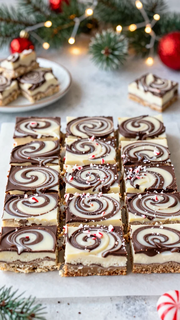 Start by melting dark chocolate, spreading it onto a parchment-lined baking sheet, and then folding crushed peppermint candies into Cool Whip. Spread this mixture over the chocolate, and drizzle with white chocolate for an extra sweet kick! The vibrant colors and flavors make this a must-have on your holiday tray.