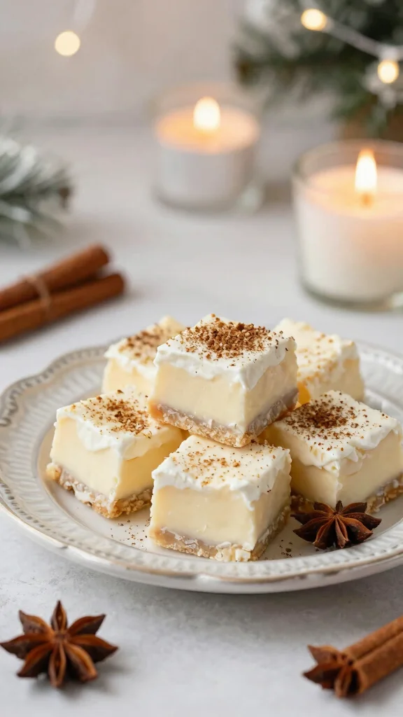 Start by melting white chocolate and mixing it with Cool Whip and eggnog to create a luscious base. After refrigerating, cut it into squares and sprinkle with nutmeg for a festive touch! This creamy treat is sure to be a holiday favorite.