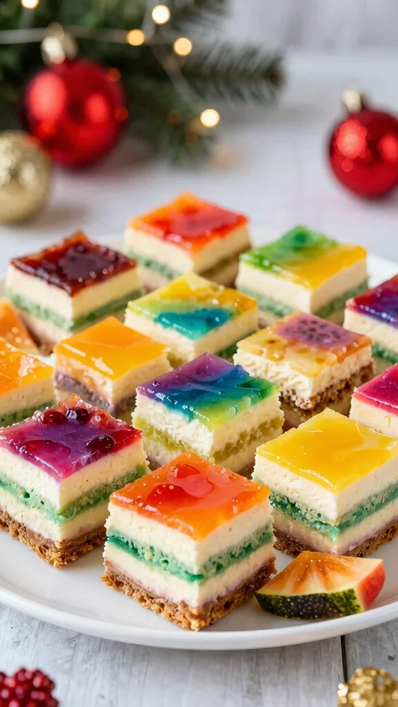 Start by creating a simple graham cracker crust, then layer colorful Cool Whip mixed with different fruit purees for a truly eye-catching treat. After a chill in the fridge, cut them into squares for a refreshing finale to your holiday meals!