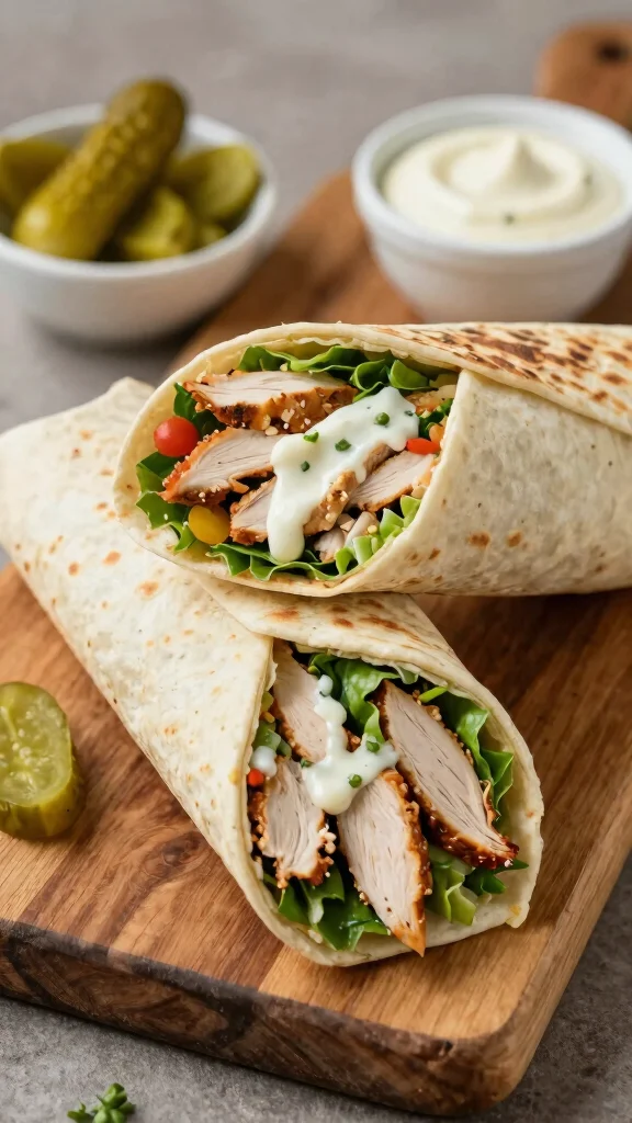 3. Assemble wraps with chicken, lettuce, cucumber, and a drizzle of garlic sauce.
