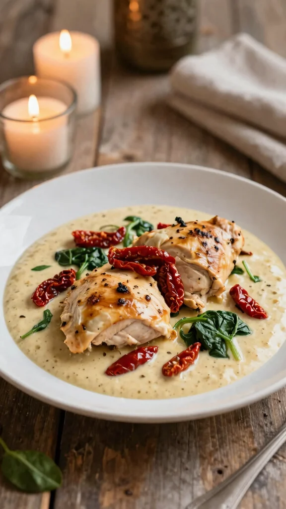 Want an indulgent yet simple meal? This creamy Tuscan chicken dish offers tender chicken in a rich sauce made from sun-dried tomatoes and fresh spinach. It’s a one-pan wonder that’s perfect for weeknights when you want something delicious without the fuss.