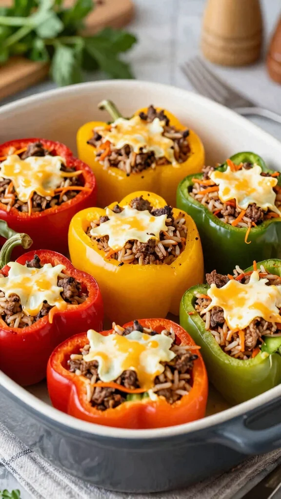Stuffed bell peppers are a vibrant and customizable dinner option that’s perfect for families! You can fill them with a variety of ingredients, from rice and meat to quinoa and veggies, making them a versatile dish that caters to different tastes and dietary preferences. They’re not only fun to make but also a joy to eat!
